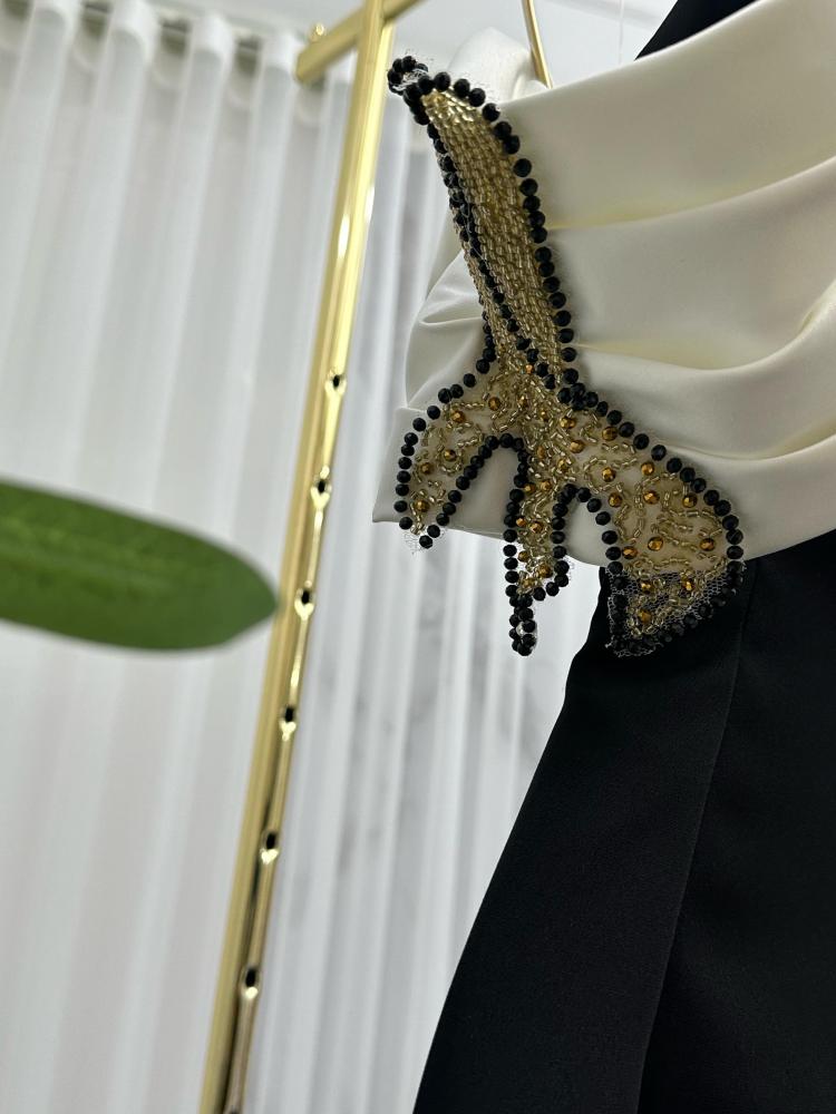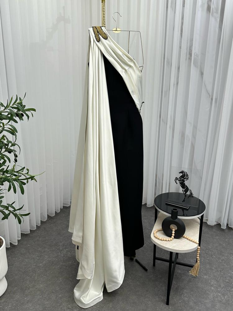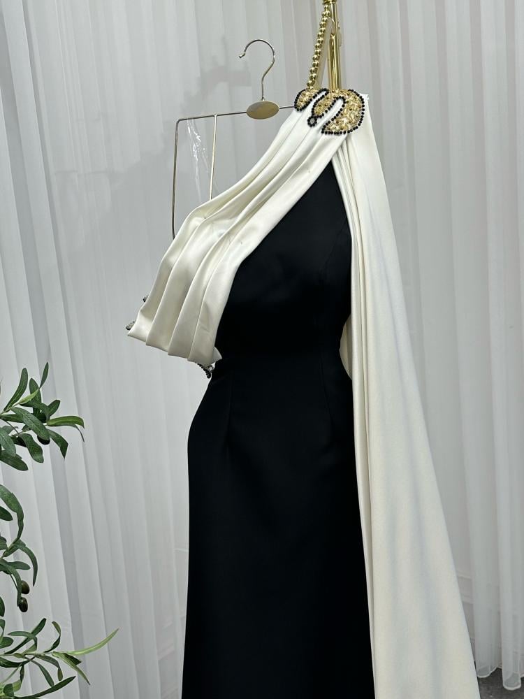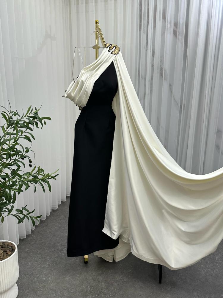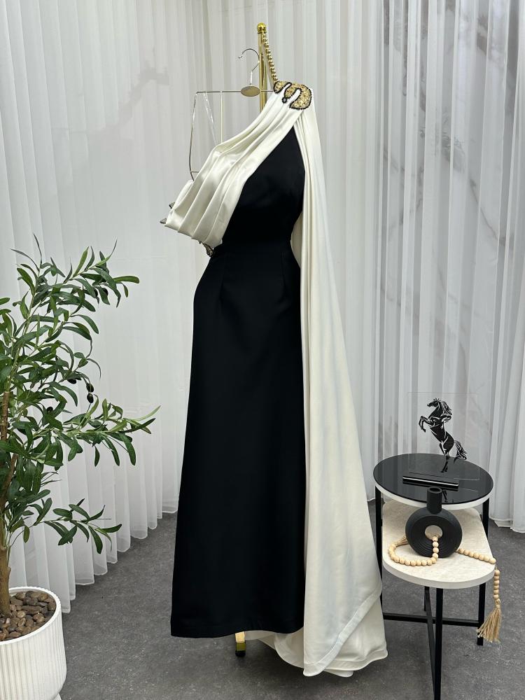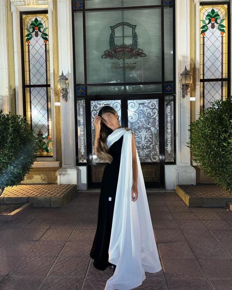 فستان سهرة أسود أنيق مزين بوشاح أبيض فاخر، تصميم كلاسيكي يجمع بين البساطة والفخامة. مثالي للمناسبات الخاصة وحفلات الزفاف والسهرات، يمنحك إطلالة راقية تخطف الأنظار بلمسة عصرية مميزة