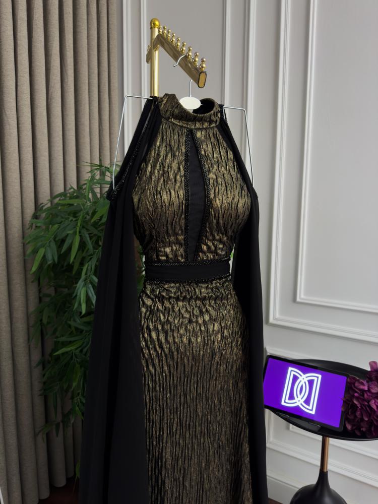فستان سهرة فاخر بلون ذهبي مائل للأسود بتصميم عصري أنيق يعكس الفخامة والأنوثة. يتميز بقماش لامع فخم بقصة ضيقة عند الخصر تُبرز القوام، مع كاب شفاف من الشيفون الأسود ينسدل بانسيابية ليمنح إطلالة ملكية آسرة. يناسب السهرات الفاخرة والمناسبات الخاصة بإطلالة تجمع بين الجرأة والرقي
