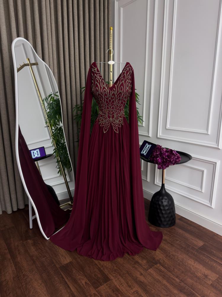 فستان سهرة فاخر بلون عنّابي ملكي بتصميم طويل وانسيابي يعكس الأناقة والرقي. يتميز بتطريز يدوي فاخر بخيوط لامعة على منطقة الصدر والخصر بأسلوب زهري أنثوي جذّاب، مع أكمام طويلة تمنح إطلالة فخمة ومحتشمة. القماش انسيابي ناعم ينسدل برقي ليبرز جمال القوام. مثالي للحفلات والمناسبات الراقية.