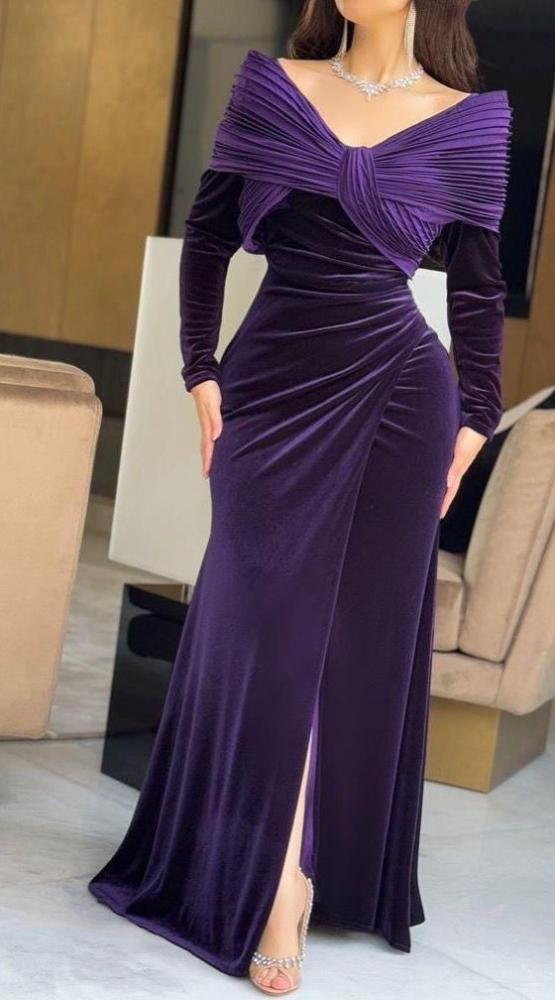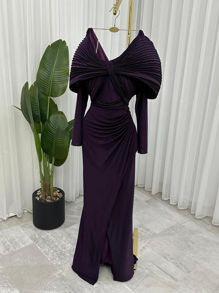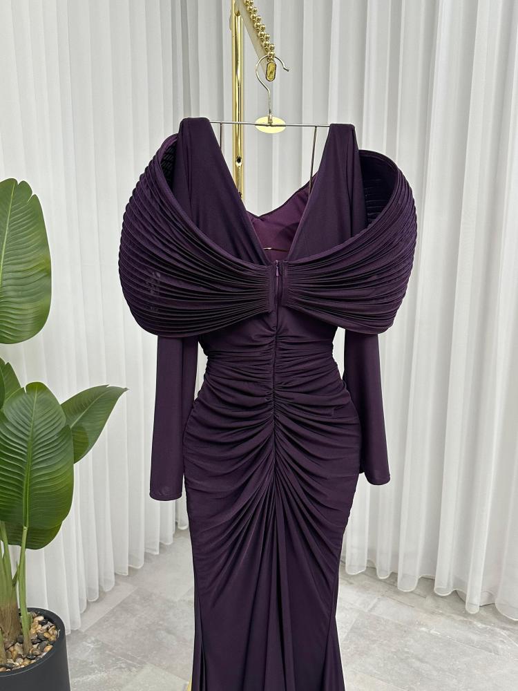 فستان سهره ليلكي ذو أكمام على كسرات من الكتف الخامة كريستال سترتش