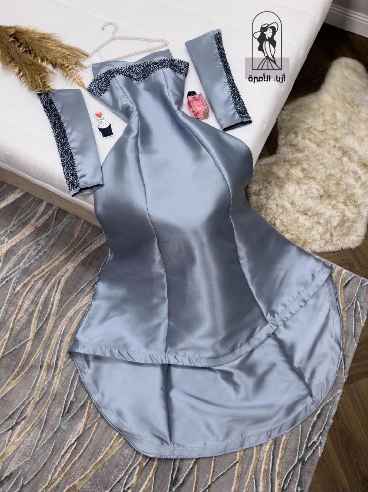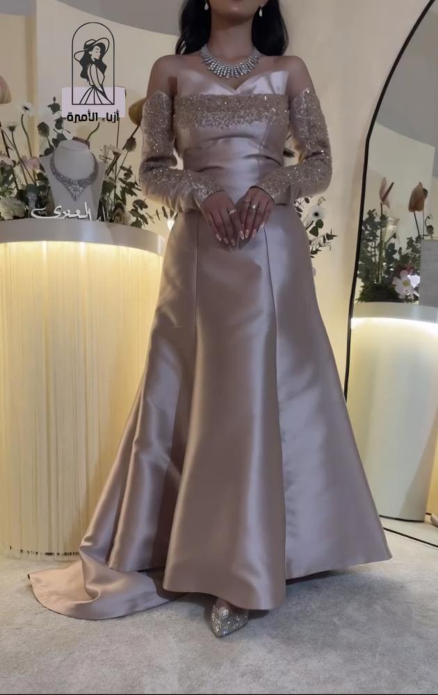 فستان مزون كولكشن سهره تطريز يدوي رااقي على ميكادو لونين لحمي+ رصاصي