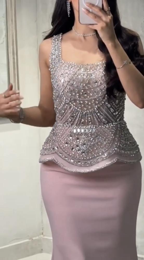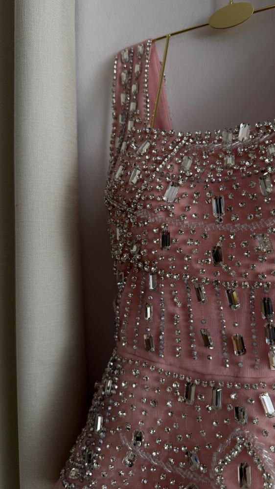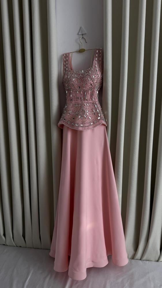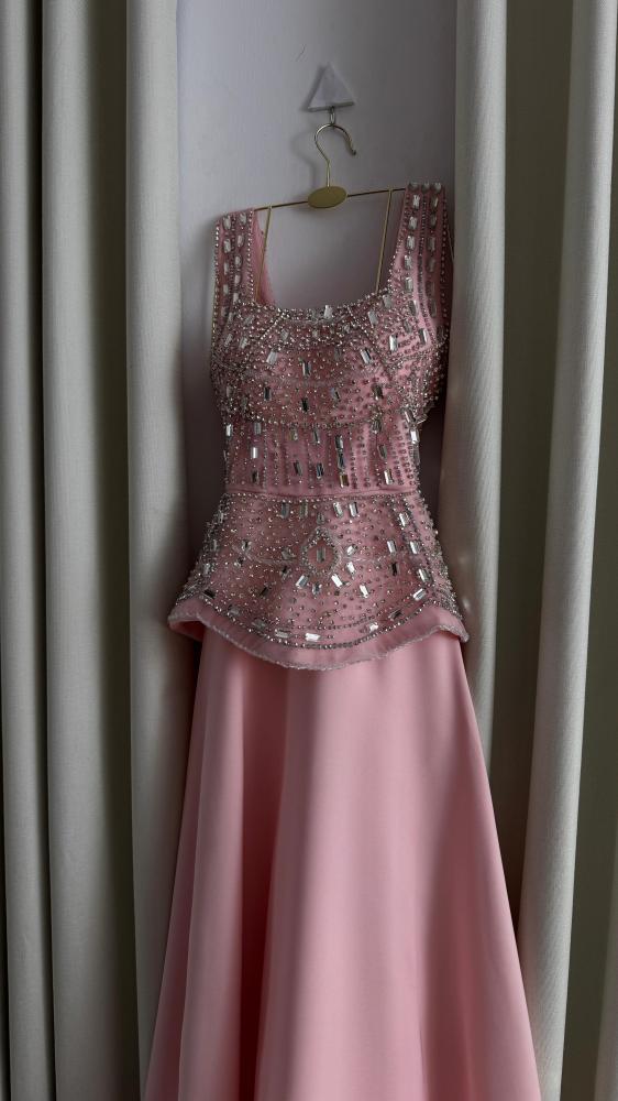 فستان سهرة أنيق باللون الوردي الفاتح، بتصميم راقٍ يجمع بين الفخامة والأنوثة. يتميز الجزء العلوي بتطريز فاخر من الخرز والفصوص اللامعة التي تعكس الإضاءة بأسلوب جذاب، مع قصّة مخصّرة تبرز جمال القوام وأنوثة الإطلالة. تنساب التنورة بسلاسة لتمنح مظهراً راقياً مثاليّاً للمناسبات والسهرات الفاخرة