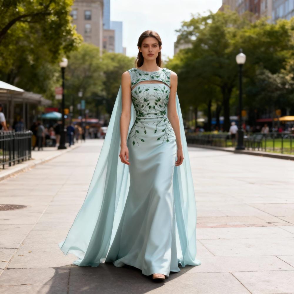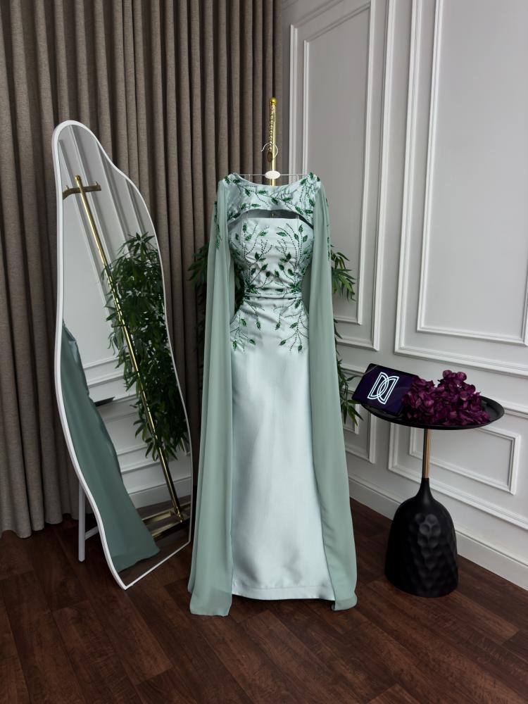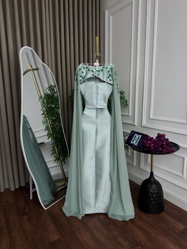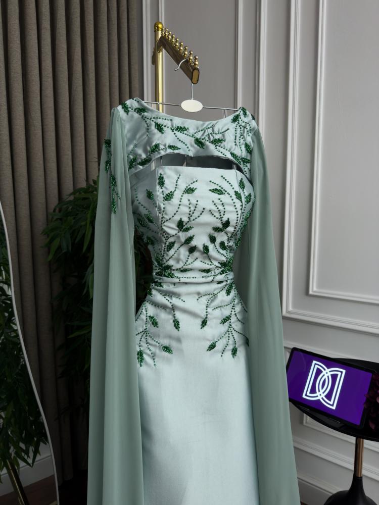 فستان سهرة راقٍ بلون أزرق سماوي فخم، يتميز بتصميم انسيابي من قماش ناعم فاخر يمنح إطلالة ملكية أنيقة. مزين بتطريز يدوي دقيق على منطقة الصدر والخصر بنقوش أوراق خضراء تضيف لمسة من الفخامة والجاذبية. يتميز الفستان بذيل ناعم من القماش المنسدل كالكاب ليمنحك حضوراً لافتاً في المناسبات والسهرات الفاخرة