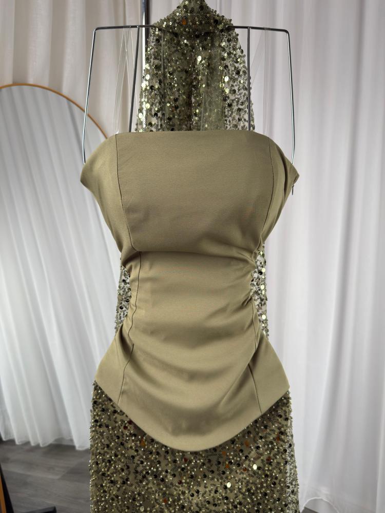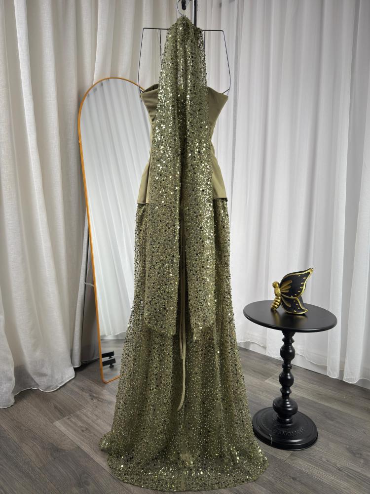 فستان سهرة أنيق بتصميم فخم يجمع بين الأنوثة والرقي، يتميز بصدريّة وبطانه من قماش الباربي الفاخر تمنح ثباتًا وأناقة مميزة، مع تنورة مطرزة بالكامل بالترتر والخرز اللامع بلون زيتي جذّاب يلفت الأنظار في كل مناسبة. مثالي للسهرات والمناسبات الفاخرة بلمسة تجمع بين الفخامة والتميز العصري